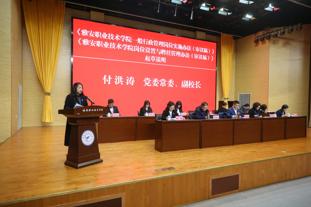学校党委常委、副校长付洪涛同志向大会作《雅安职业技术学院一般行政管理岗位实施办法(审议稿)》《雅安职业技术学院岗位设置与聘任管理办法(审议稿)》(简称“两个《办法》”)的起草说明;全体代表分为四个代表团,对两个《办法》进行了全面审议和讨论,并在其后的全体代表大会上通过无记名投票方式高票通过了两个《办法》。