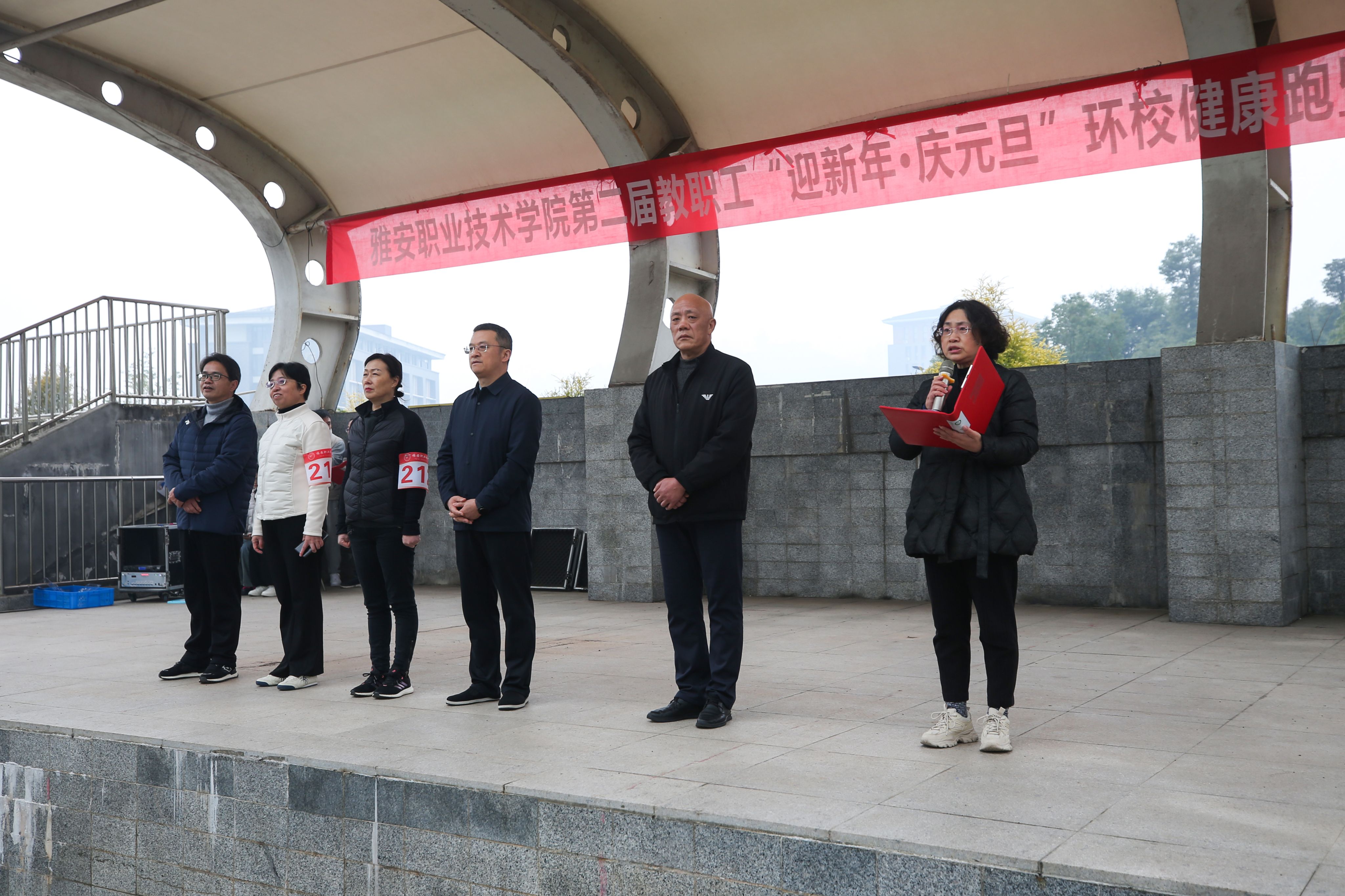 300余名教职工组成的12支代表队在庄严的国歌声肃立操场,黄诚校长代表学校党政向广大教职工致以亲切的新年的问候,并宣布:“雅安职业技术学院第二届教职工‘迎新年·庆元旦’环校健康跑暨趣味运动会开幕!”