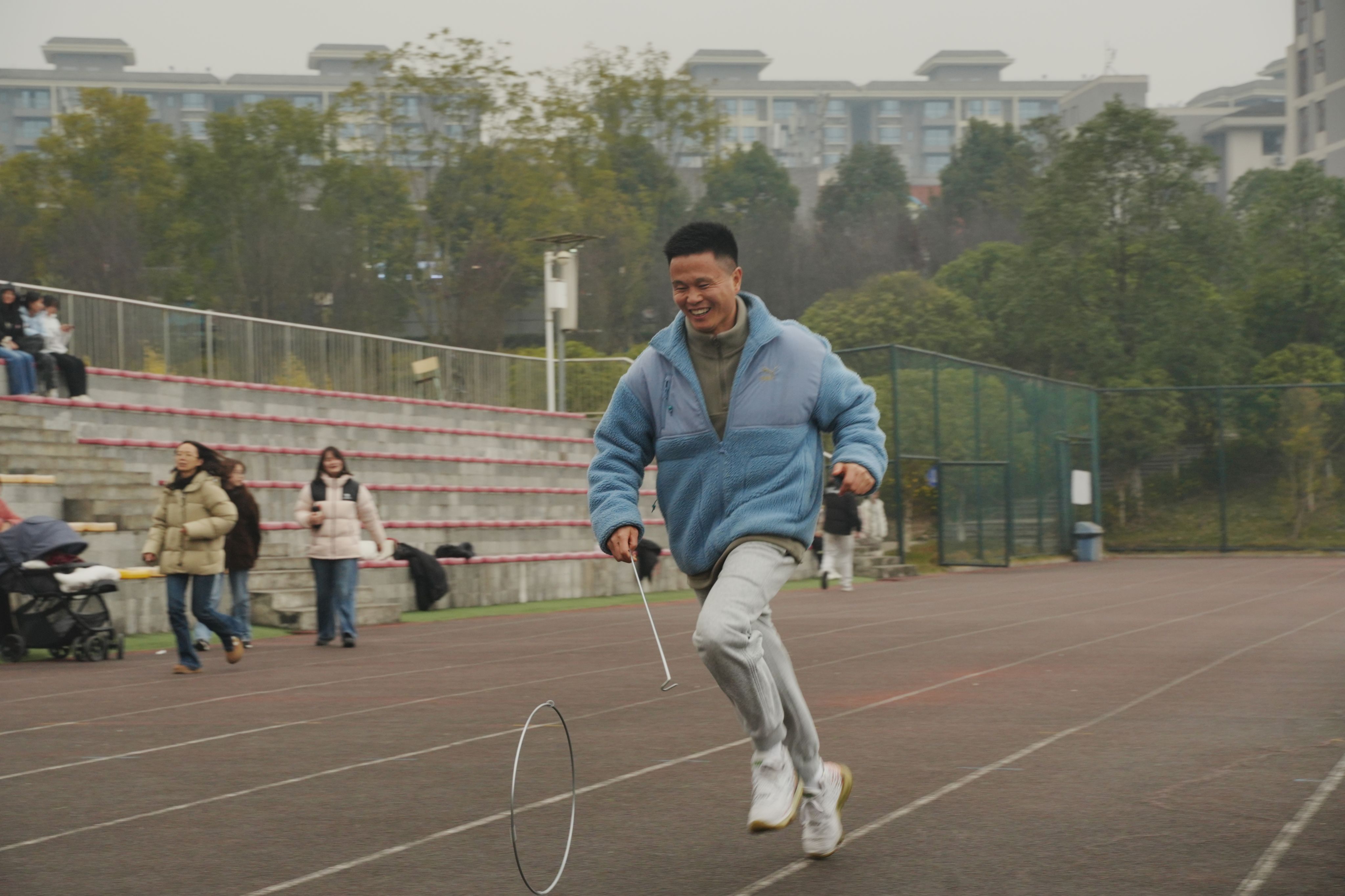 趣味运动会上,赶猪接力、毛毛虫竞速、400米滚铁环接力、八人九足、集体跳绳等项目轮番上阵。各代表队团结协作、奋勇争先,现场欢呼声与助威声不绝于耳,在轻松愉快的氛围中展现出良好的体育风貌与团队精神。